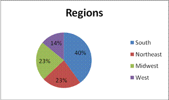 Of the 190 surveys distributed to 38 schools, 78 families returned surveys from 23 schools for a return rate of 41%. The Ohio School for the Deaf completed additional surveys. The regional representation included: 40% South, 23% Northeast, 23% Midwest, and 14% West. [See Regions Graph]
